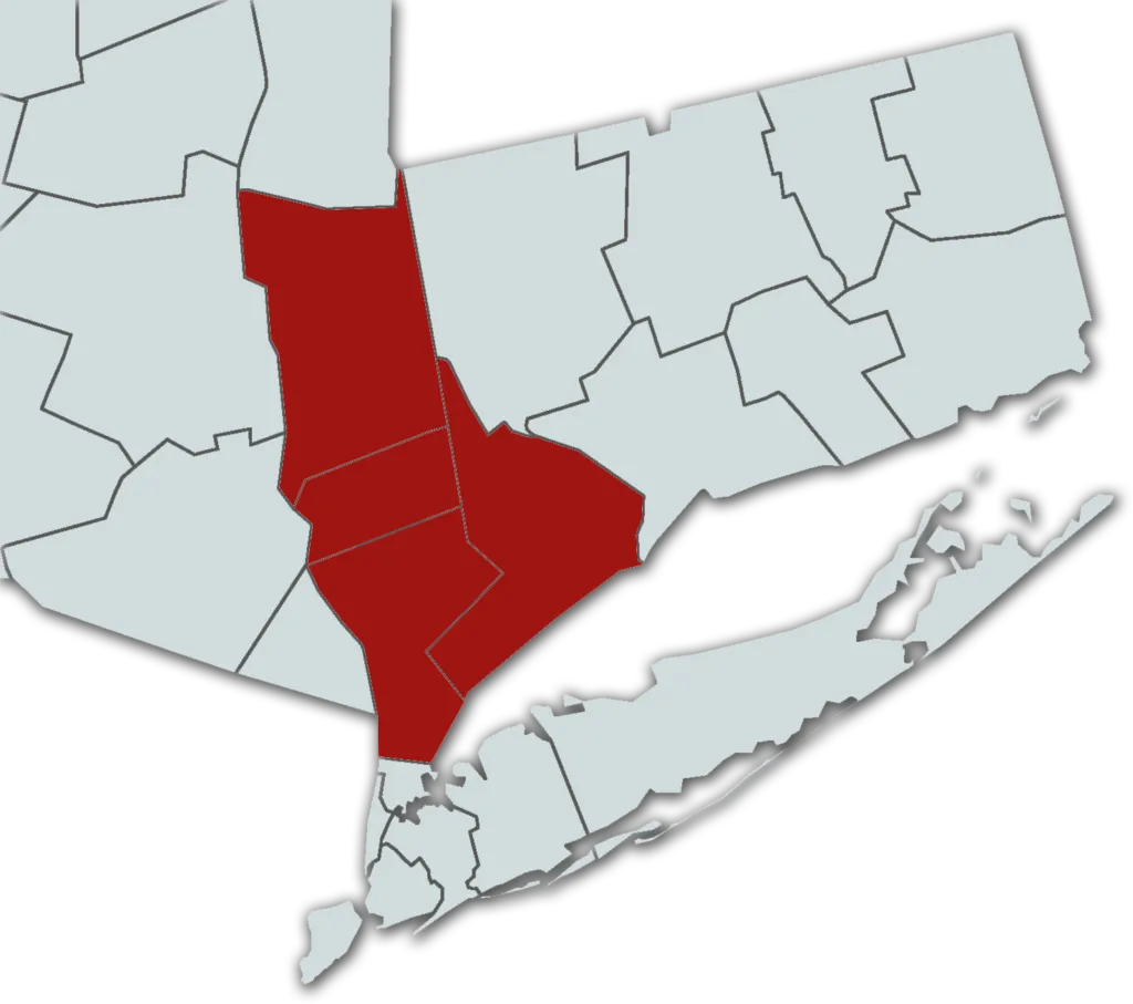 Fairfield County, CT: Danbury, Ridgefield, Redding, Wilton, Newtown, Monroe, Southbury, Brookfield, New Fairfield, New Milford, Bridgewater, Roxbury, Kent, Easton, Westport, Weston, Stamford, Norwalk, Fairfield, New Canaan, and Greenwich.